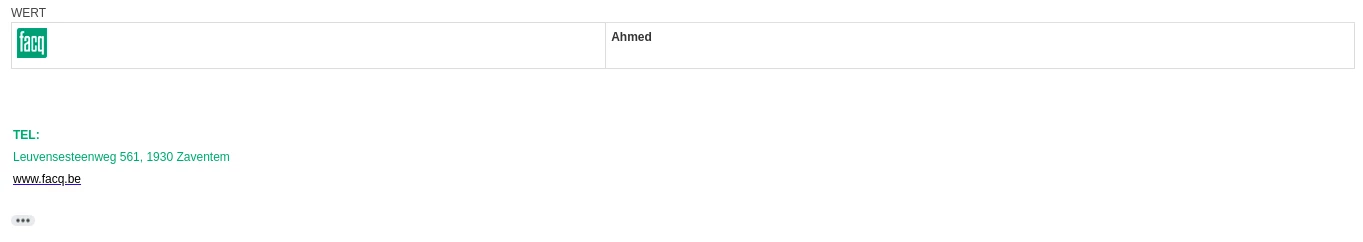 <div id="content" style="width: 250; font-family: Arial, sans-serif; font-size: 11px; font-variant: small-caps; margin-left: 2px; margin-top: 5px;"><span style="font-weight: bold; font-style: italic; color: #333333;">{{current_user.signature}}</span><br /><span style="font-weight: bold; font-size: 11px; color: #009966;">TEL:</span> {{current_user.phone}} <br /><span style="font-size: 11px; color: #009966;">Leuvensesteenweg 561, 1930 Zaventem</span><br /><a href="http://www.facq.be" target="_blank"><span style="color: #000000; font-variant: normal;">www.facq.be</span></a></div>