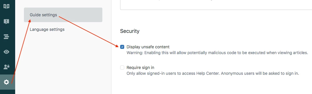 Check the box  'Display unsafe content' in the Guide setting > Security section.
