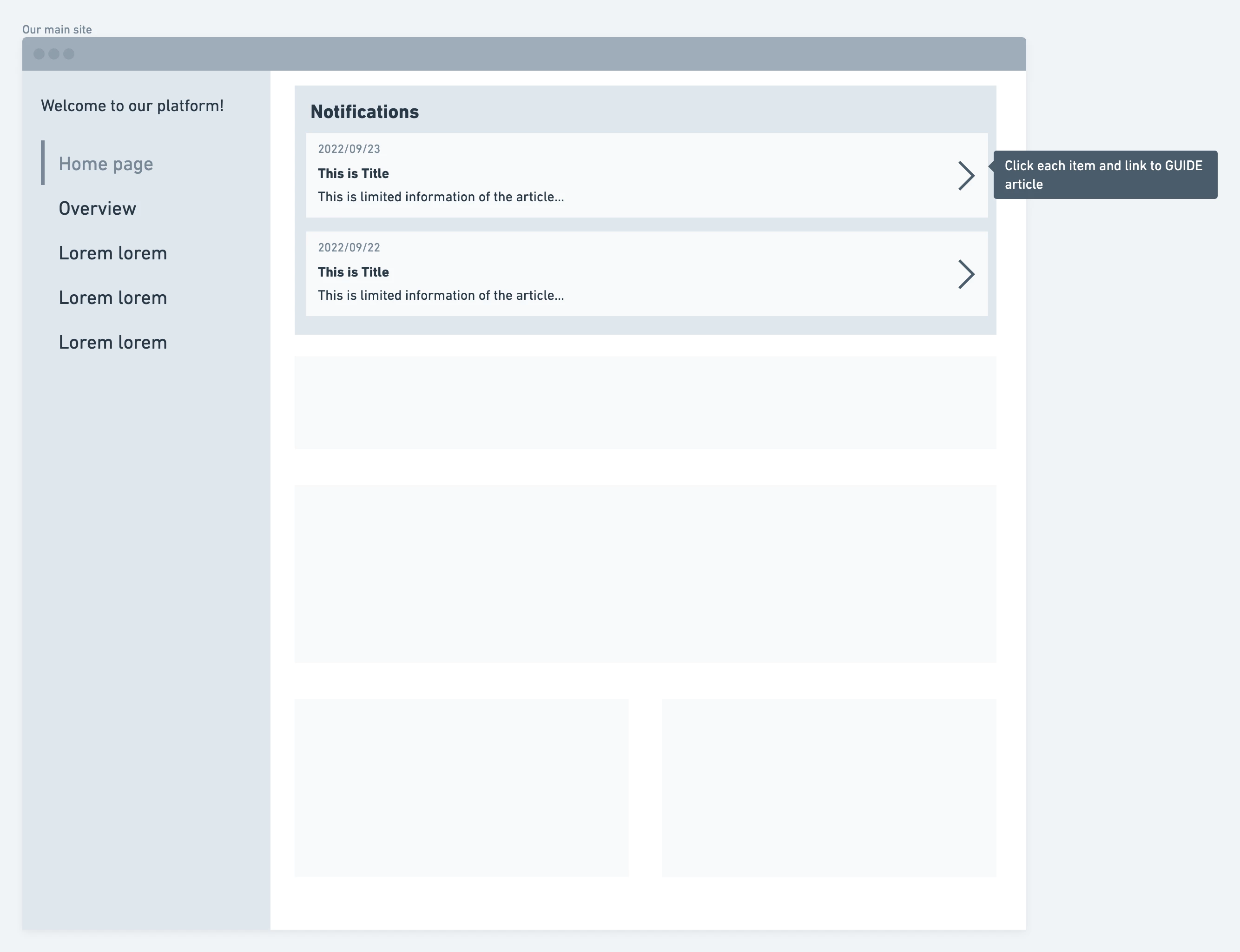The upper component "Notification" display part of information of latest article on GUIDE. If new article released, user might be able to aware of it.
