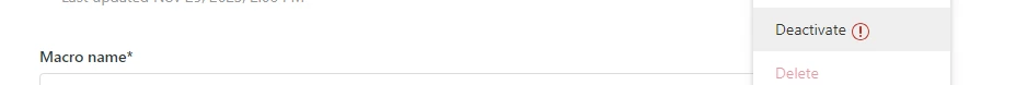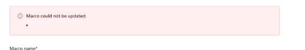 Hi. I am unable to edit pre-existing macros. I am only trying to update the text or the subject line but when I try to save, I get an 'Unsaved' in red with an exclamation mark. A bulleted blank message shows up in red as well: "Macro could not be updated: *bullet point*" but with with reason for the error.