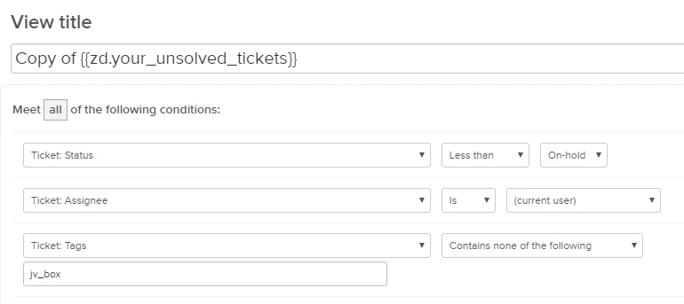 In the standard "Your Unsolved Tickets" view. It behaves as normal... but I want to filter out tickets that are currently On-Hold AND Contains Tag: jv_box. These tickets, still belong to the agent but are no longer their problem, unless the customer replies back.