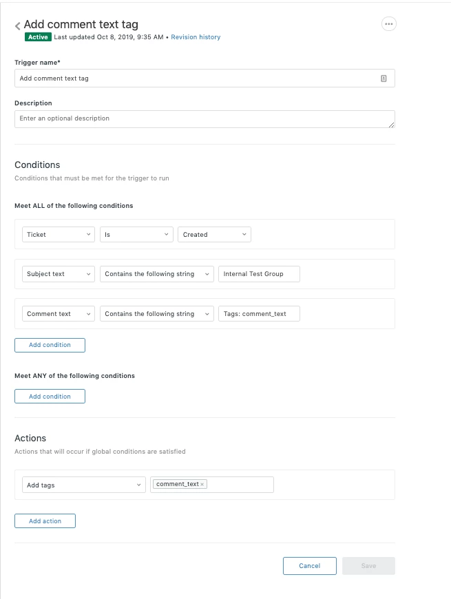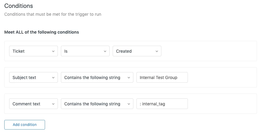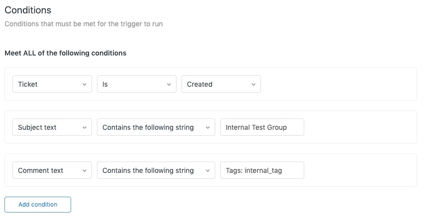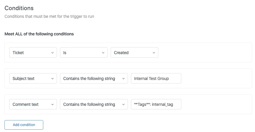 I'm building a workflow requiring that the Subject Text contains a string of words, and also that the Comment Text contain a specific string of words. When testing the trigger using only the Subject text condition, it works fine, but once I added the condition that the Comment text must also contain a different string of text, the trigger will not fire.