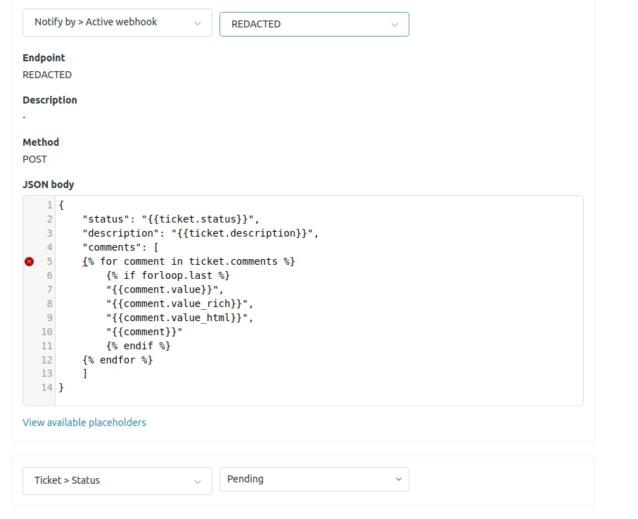 For reference This is the json that it's being generated and posted by Zendesk to the webhook: