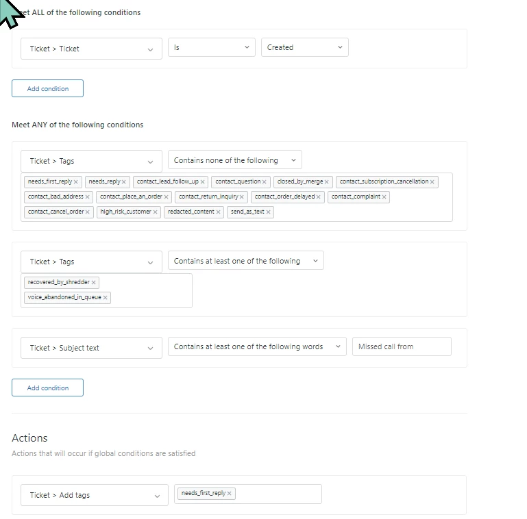 Description: Any new ticket that is not created by an agent needs to be tagged with needs_first_reply