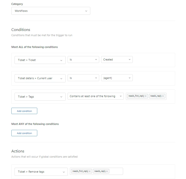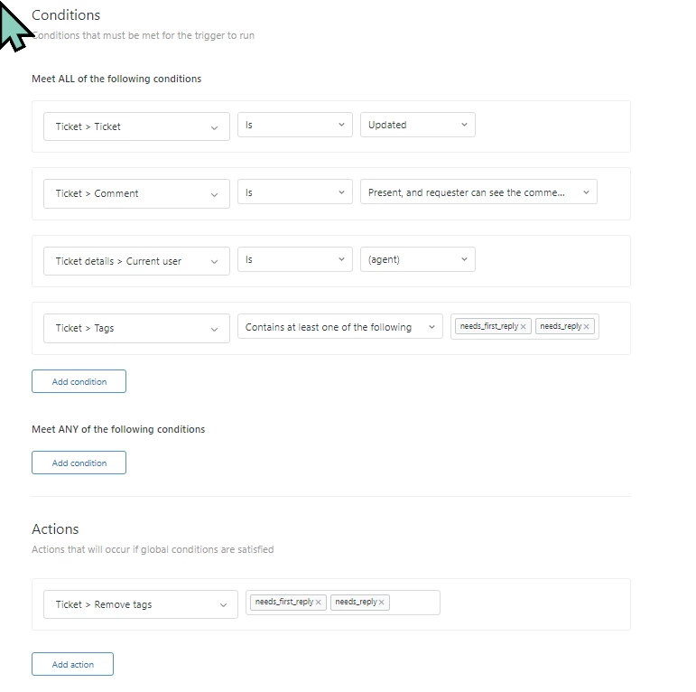 The last trigger was created because it kept tagging as needs_first_reply when the agent is the one who created the ticket, and it shouldn't be tagged based on the agent not requester (usually the customer) being the one who created the ticket or sent the email/text out.