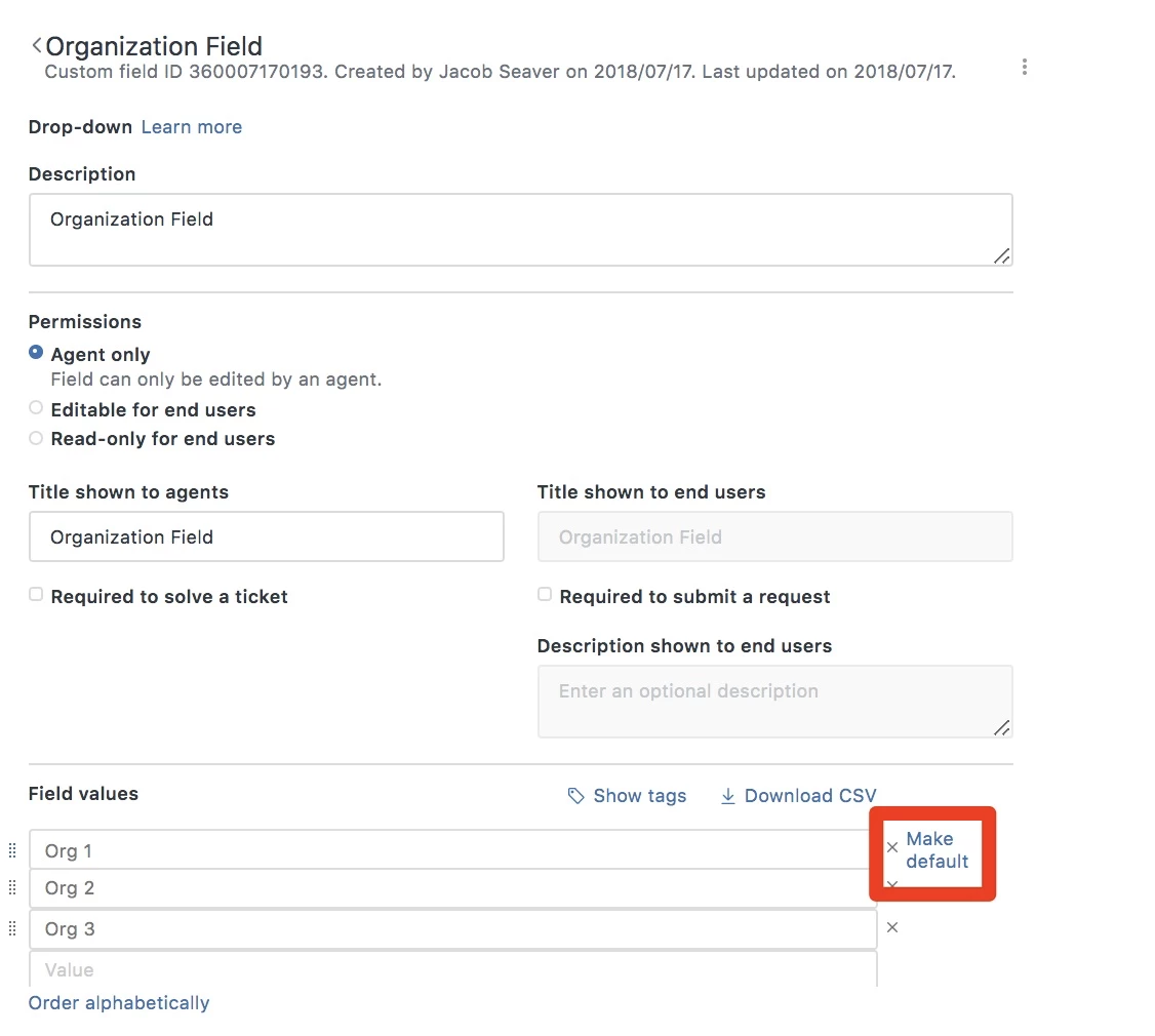 Is there a way to set a default value in a dropdown field in the ticket form?
