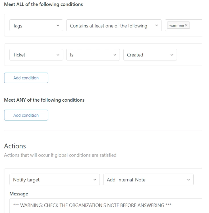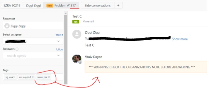 For situations where clients did not pay maintenance or having a temporary situation that requires the agents' attention, we would like to add a popup warning message on the organization/client level. For every ticket that is opened from this organization, the agent will get this popup warning message before answering the ticket.