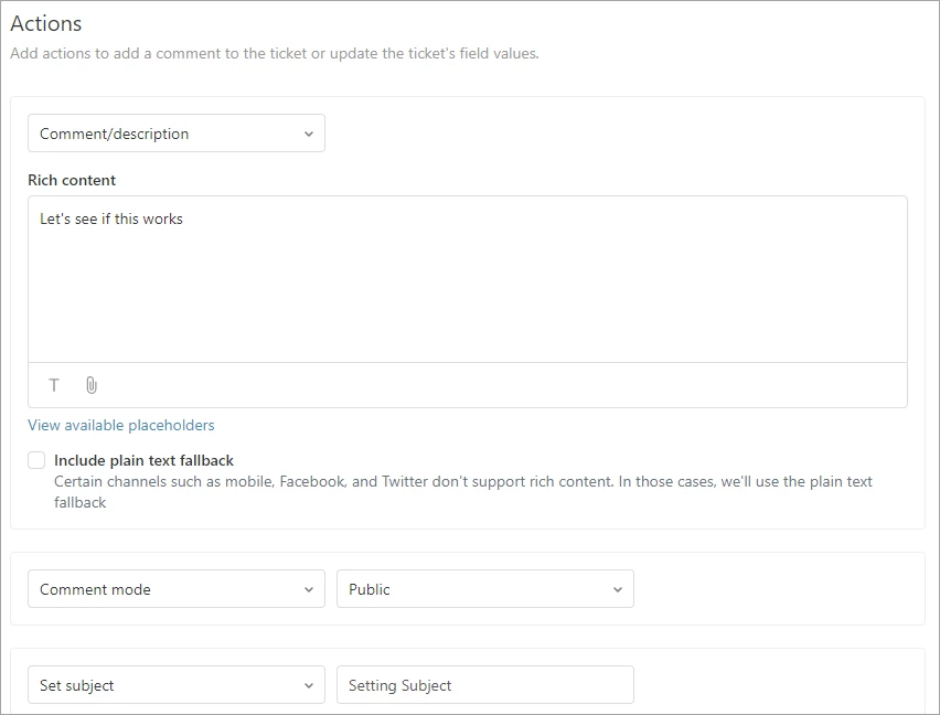 If we create a ticket to reach out to a user and use a macro with "comment mode public" on it, the left side will fill out, the subject will change, etc, but the Comment/Description isn't added to the ticket. If the macro has "comment mode private" it works correctly.