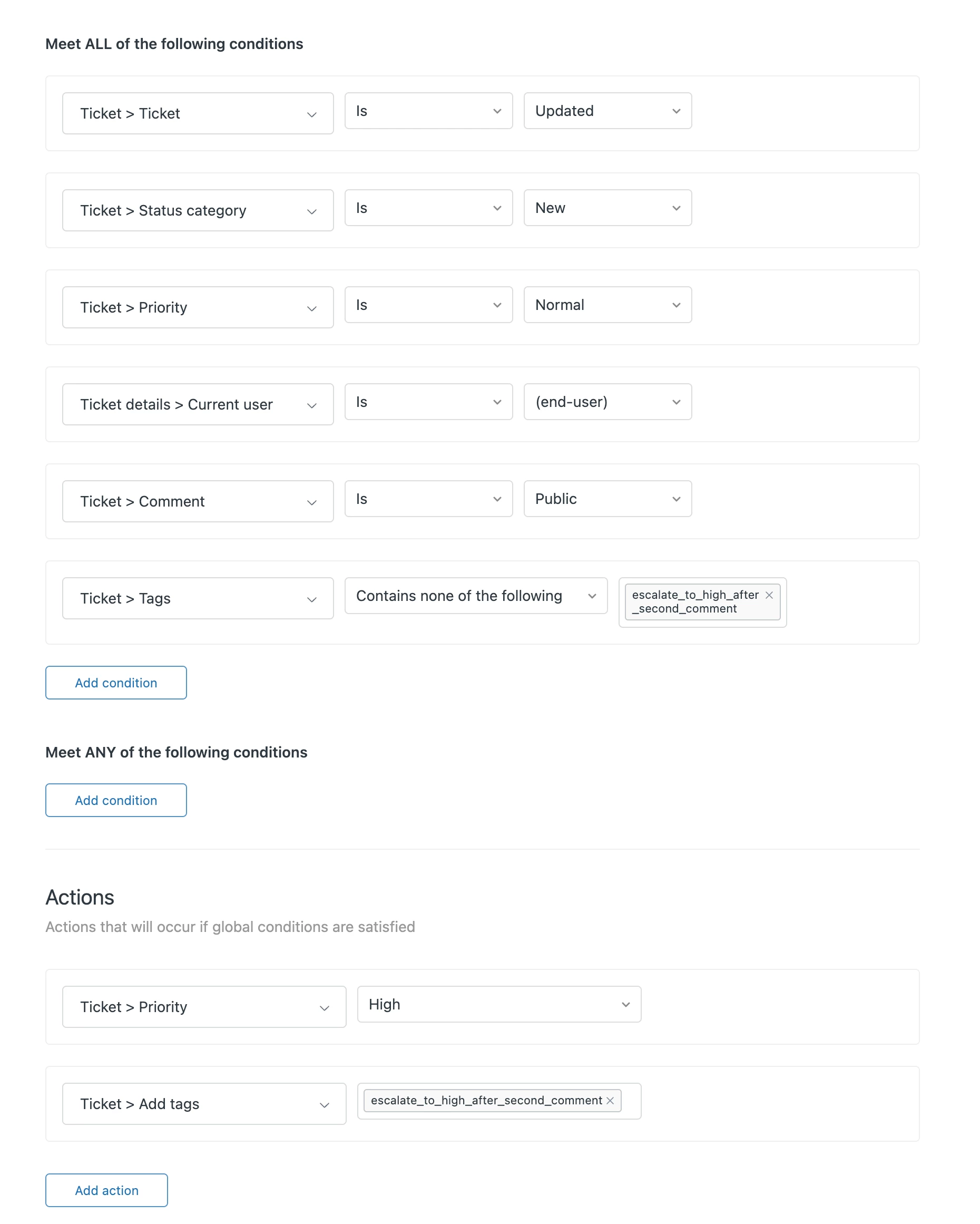 I'd like to know how to automatically have the status of a New Ticket change from Normal to High when the end-user has made contact more than twice in the same ticket.