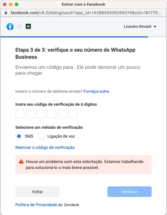 Não estou conseguindo cadastrar meu numero de telefone para o Wpp nas opções de canais, desde ontem, 06/04/2021.