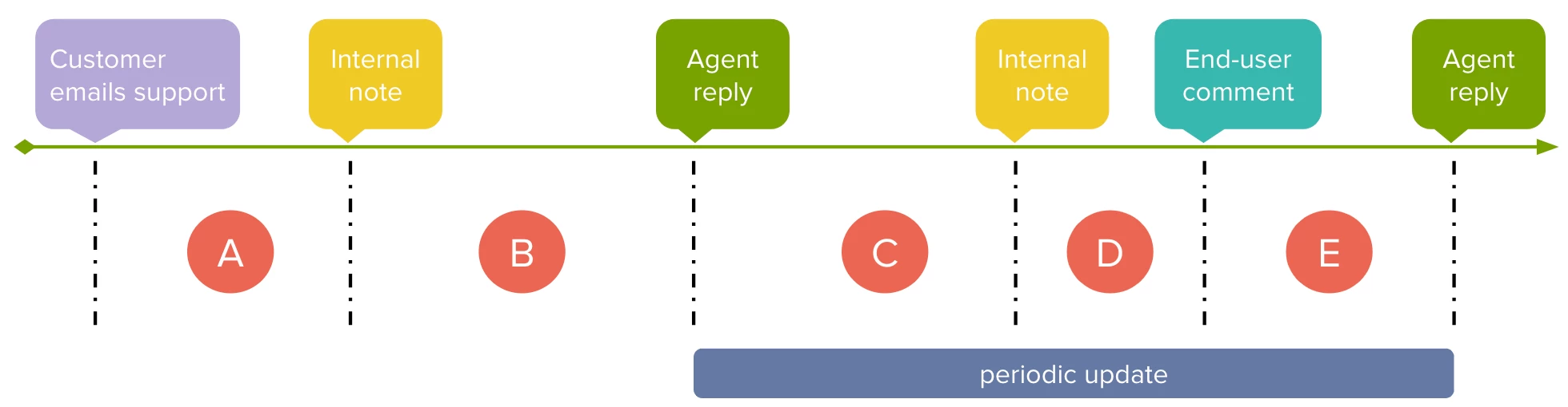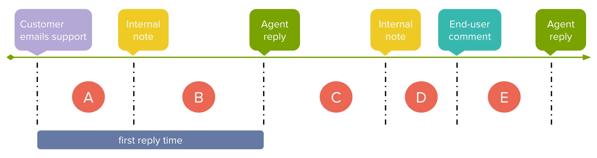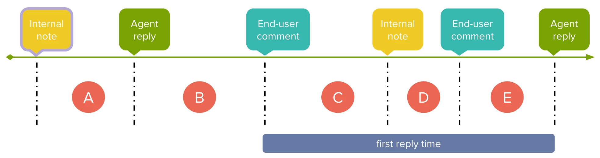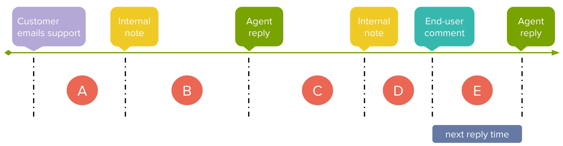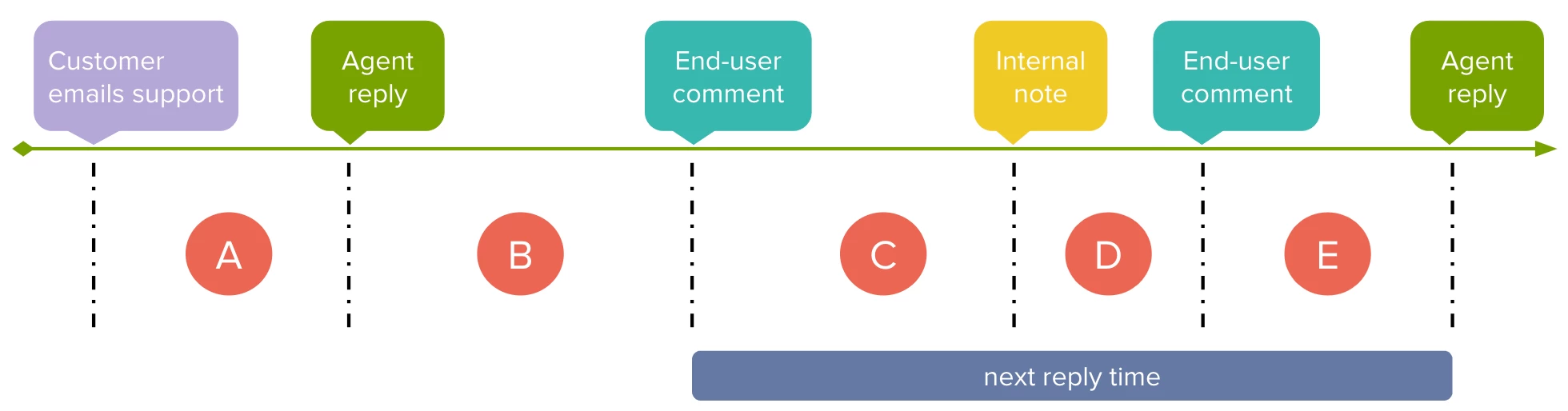The next reply time here is a combination of the segments C + D + E. Again, just reiterating that next reply time starts at oldest unanswered customer comment and continues until a public agent reply is on the ticket.