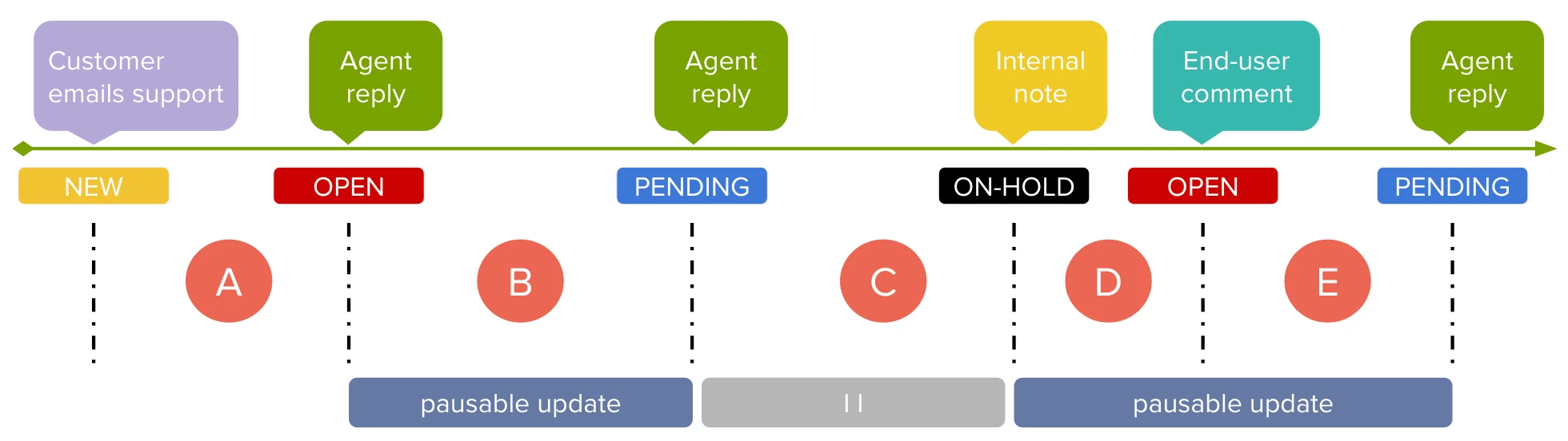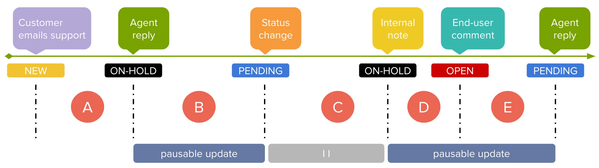 In the above example the pausable update is the combination of the segments B + D + E. The pausable update will pause when the ticket is in a pending status and continue to count while it is in a new, open, and on-hold status.