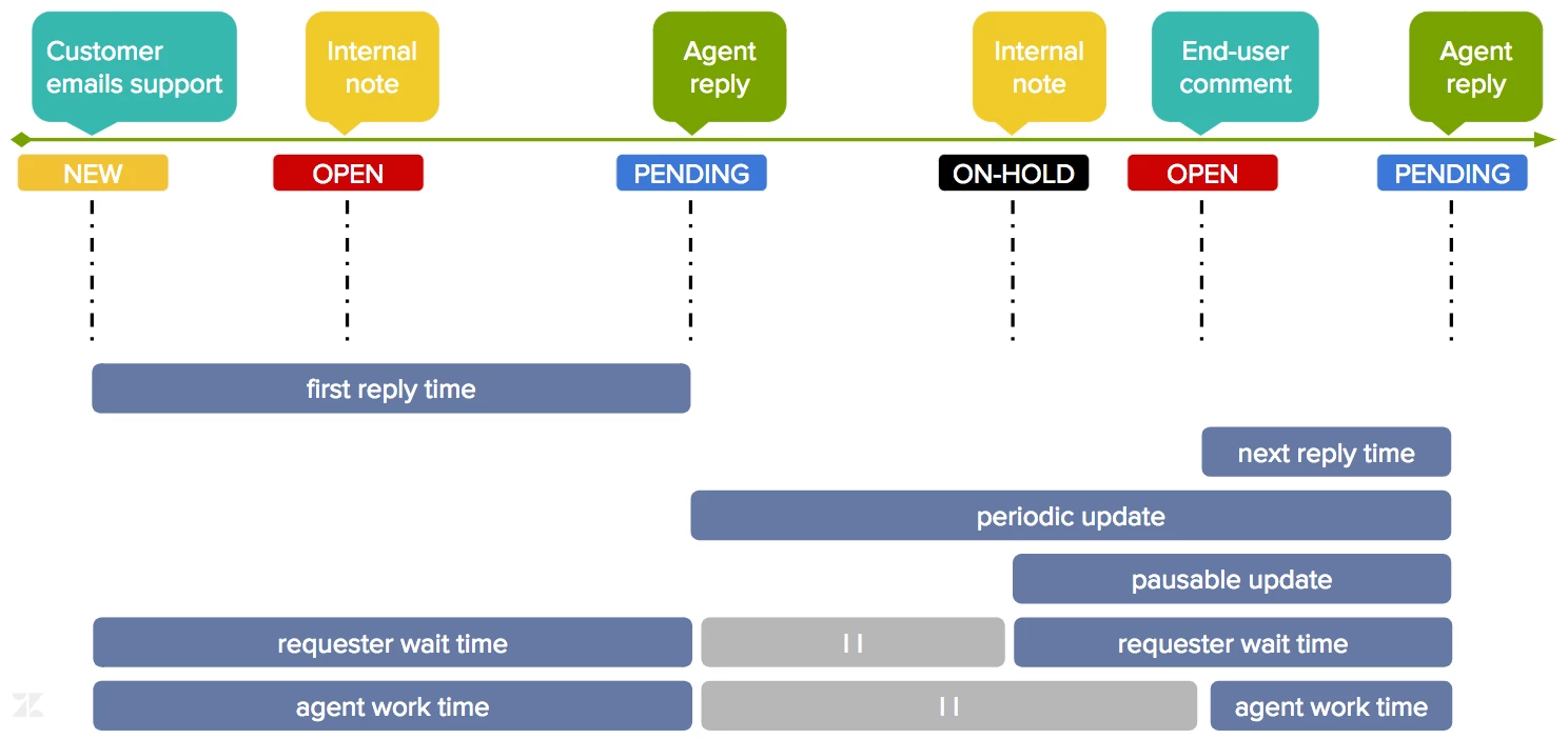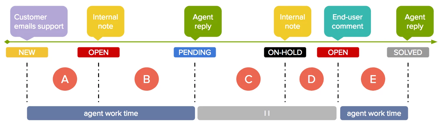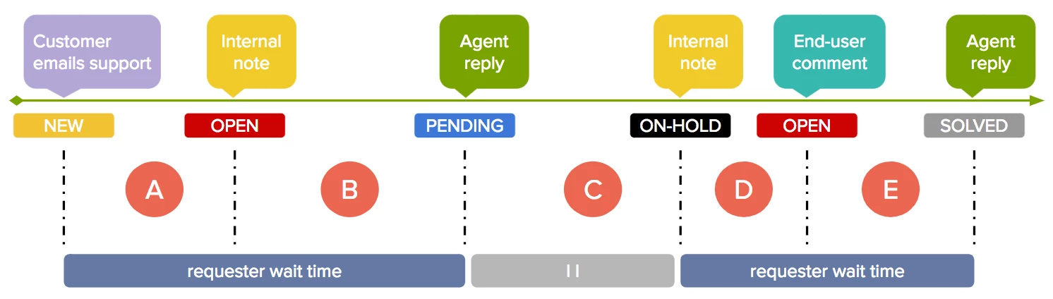 In the above example the requester wait time is the combination of segments A + B + D + E. This metric is pretty simple as it starts when the ticket is created and stops once the ticket is solved, only pausing when the ticket is in the pending status.