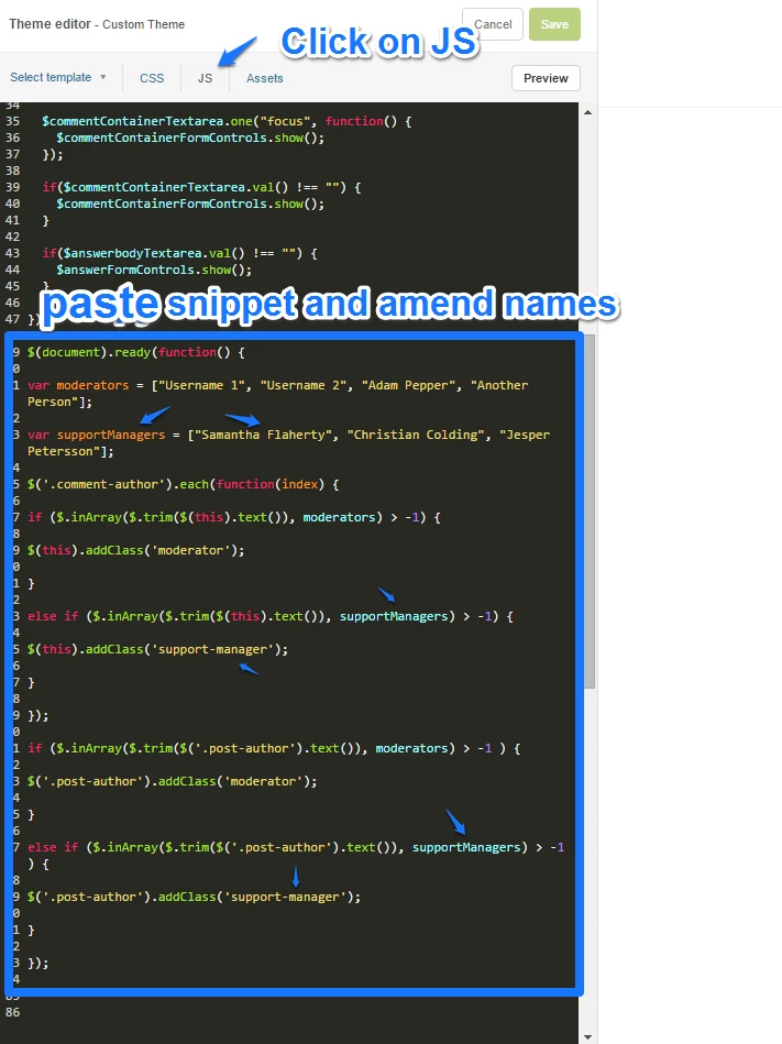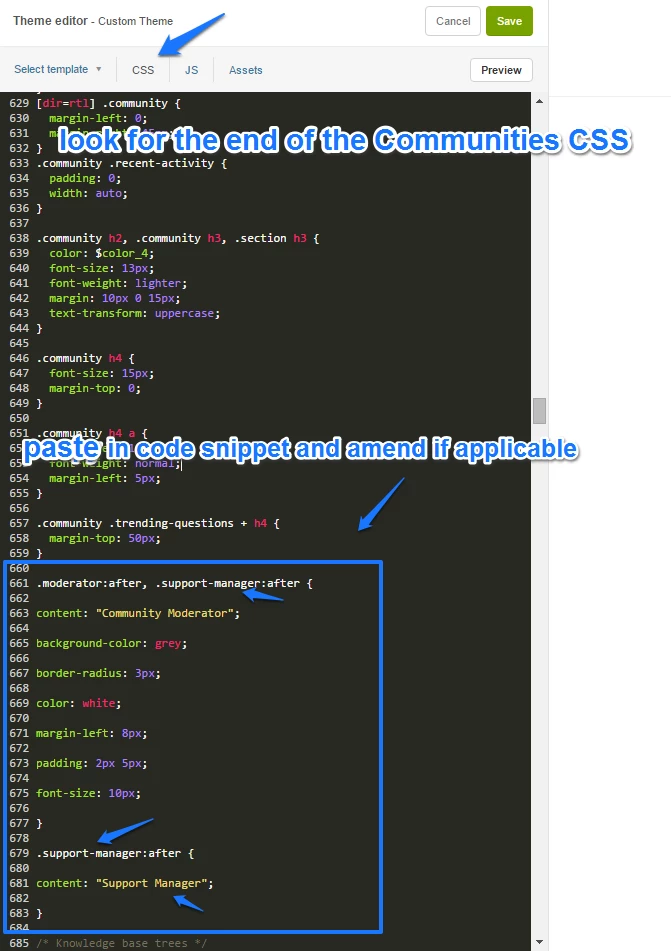 Note: whilst this is currently a workaround, it means there are some flaws (although minor). Because you need to input specific names into the code, it means that anyone on the Community with the same name is likely to have the same 'moderator' style badge appear too. So if you have agents called John Smith and lots of clients with the same name, it might get a little confusing.