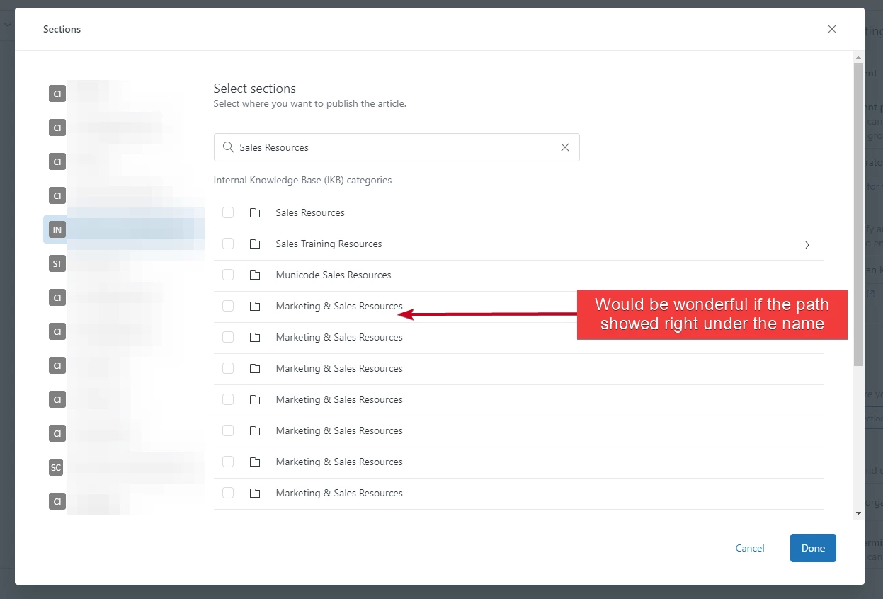 When looking at the multi-placement window, it should the placement path of the article. This would make it easy to see which location you want to post something when you have multiple sections named similarly. We have a ‘Marketing & Sales Resources’ section within each of our products, and with 15+ products if you are searching it is virtually impossible to find out which one is which without extra clicks or trial and error.