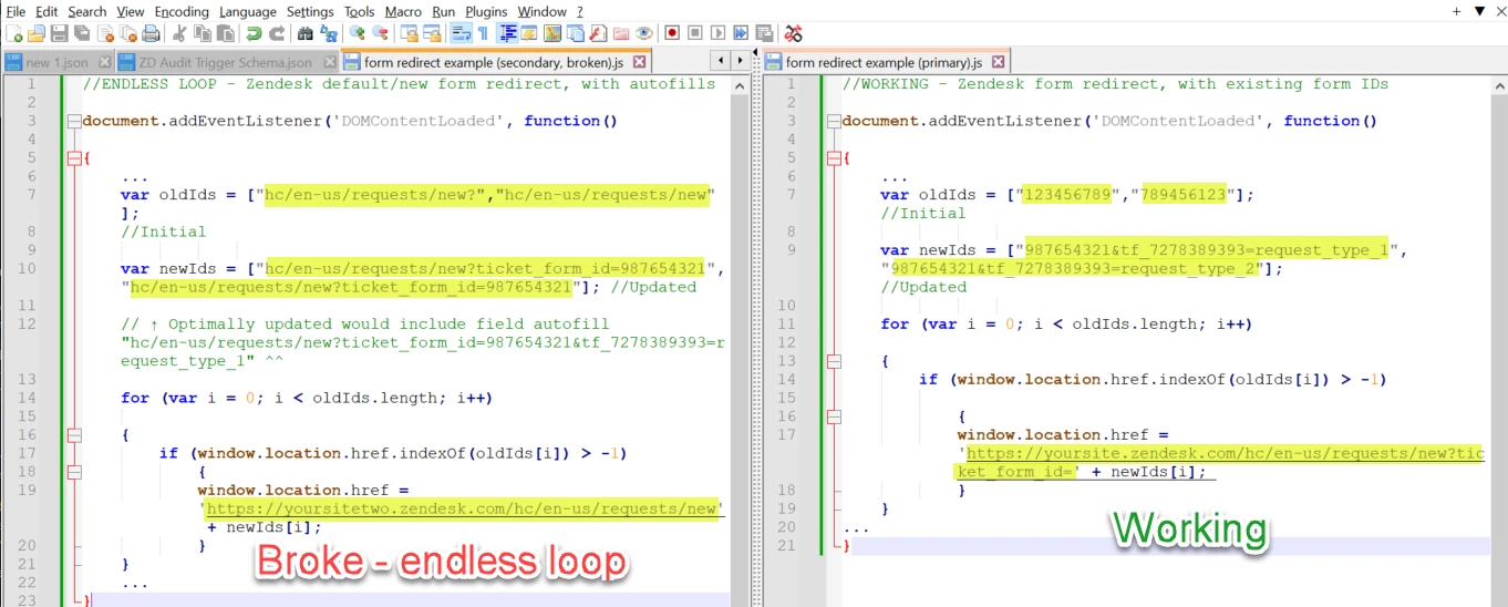 I've tried to change the window location element to include just the domain, and to include the full URL with "hc/en-us/requests/new?", and they both keep looping