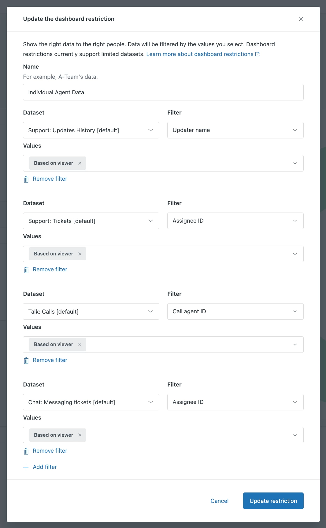 I have created Beta dashboards and put restrictions on them. However, all of the team can see the stats when I want it restricted to the individual. A colleague has done the same for her team and used the same restriction it has worked for her but is not working for me.