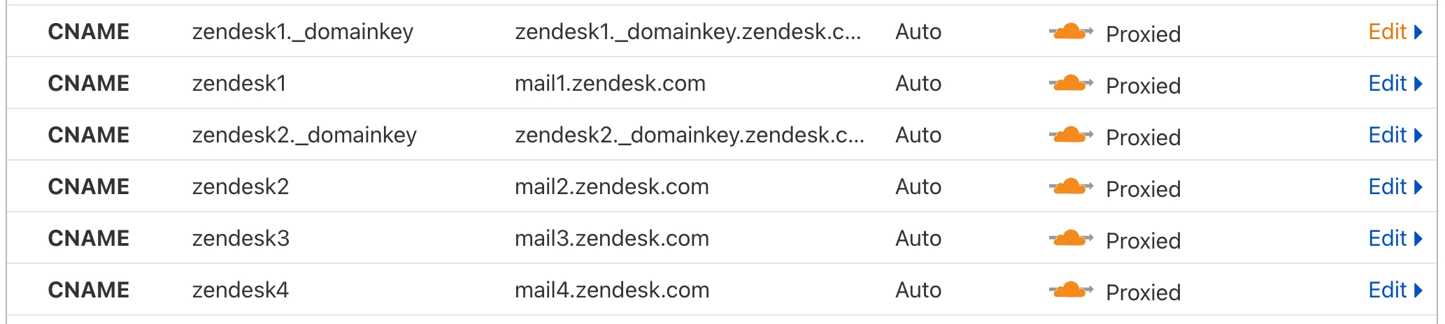 I am attaching all of my zendesk CNAME records. Can it be an issue that we use both zendesk1 pointing to mail1.zendesk.com and zendesk1._domainkey pointing to zendesk1._domainkey.zendesk.com? thats my best guess...