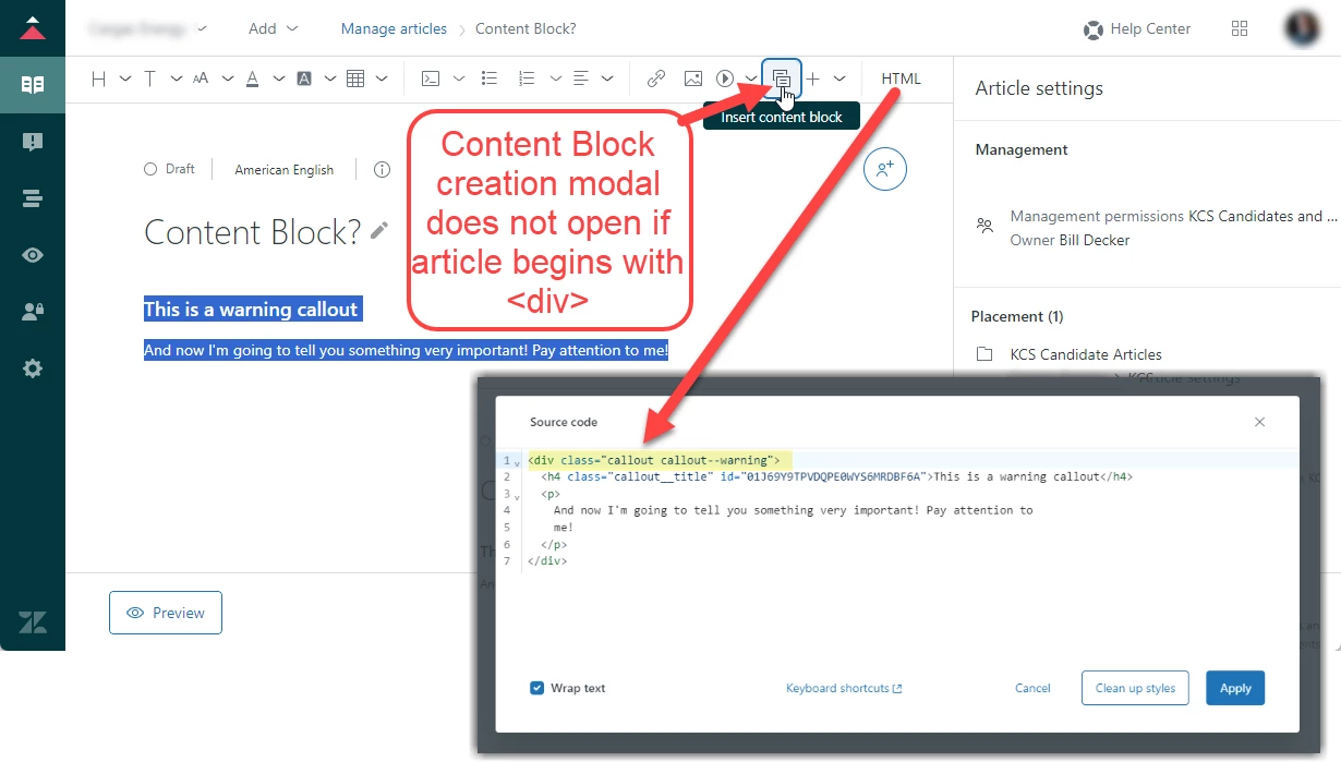 In attempting to create a new content block, I've found that it cannot be done if the article begins with a <div> tag. However, if you add a regular line of text that has a <p> tag before the <div> element, content blocks CAN be created.