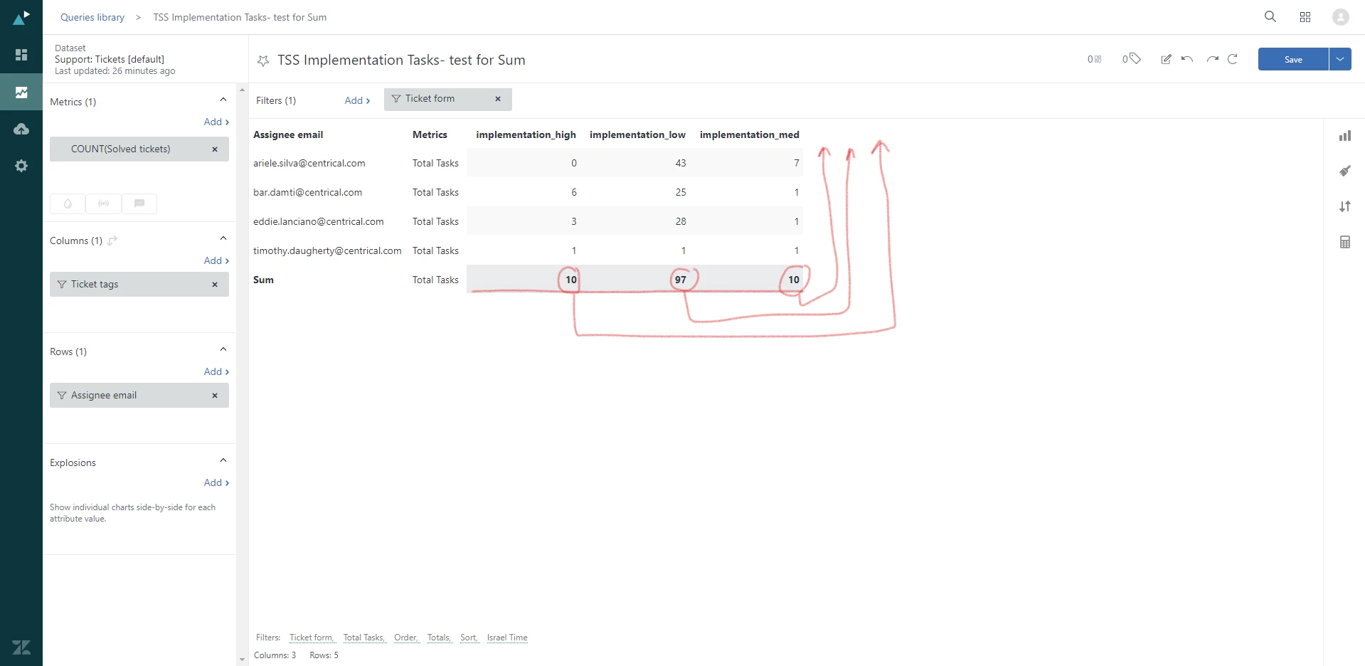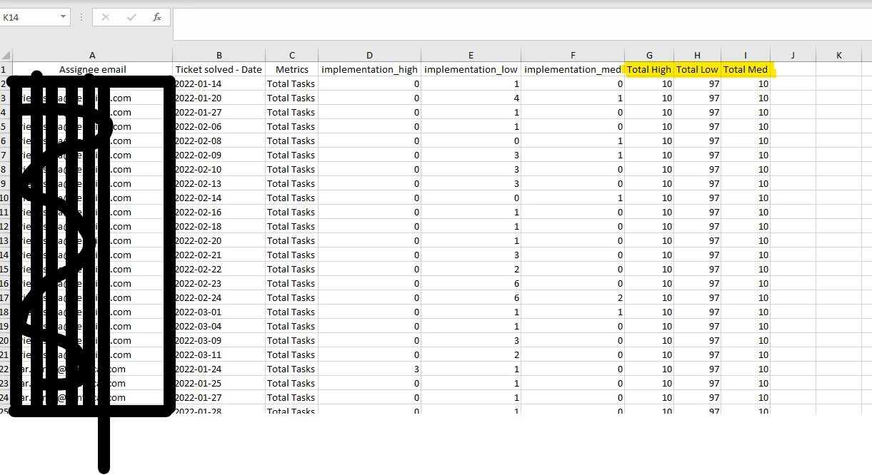 The results should present for each row the number of tickets in totals (Total High, Total Med, Total Low).