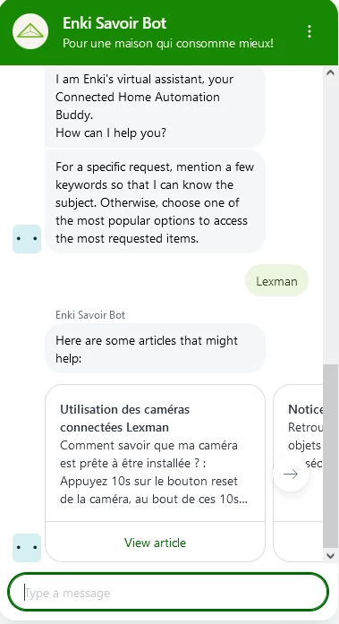 When starting a conversation, the user has the possibility either to select a proposed option and follow the implemented flow or to do a search using keywords.