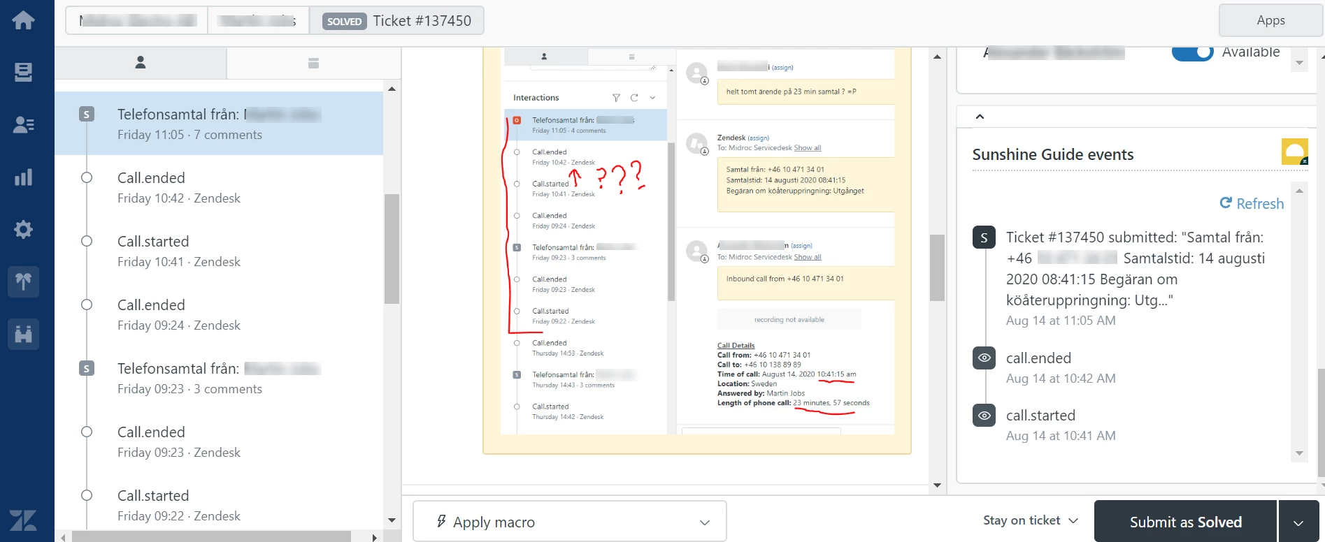 The Zendesk Talk log in the interaction list displays several 1 minute calls the same day and also that there was two incoming calls without an ending call... =/