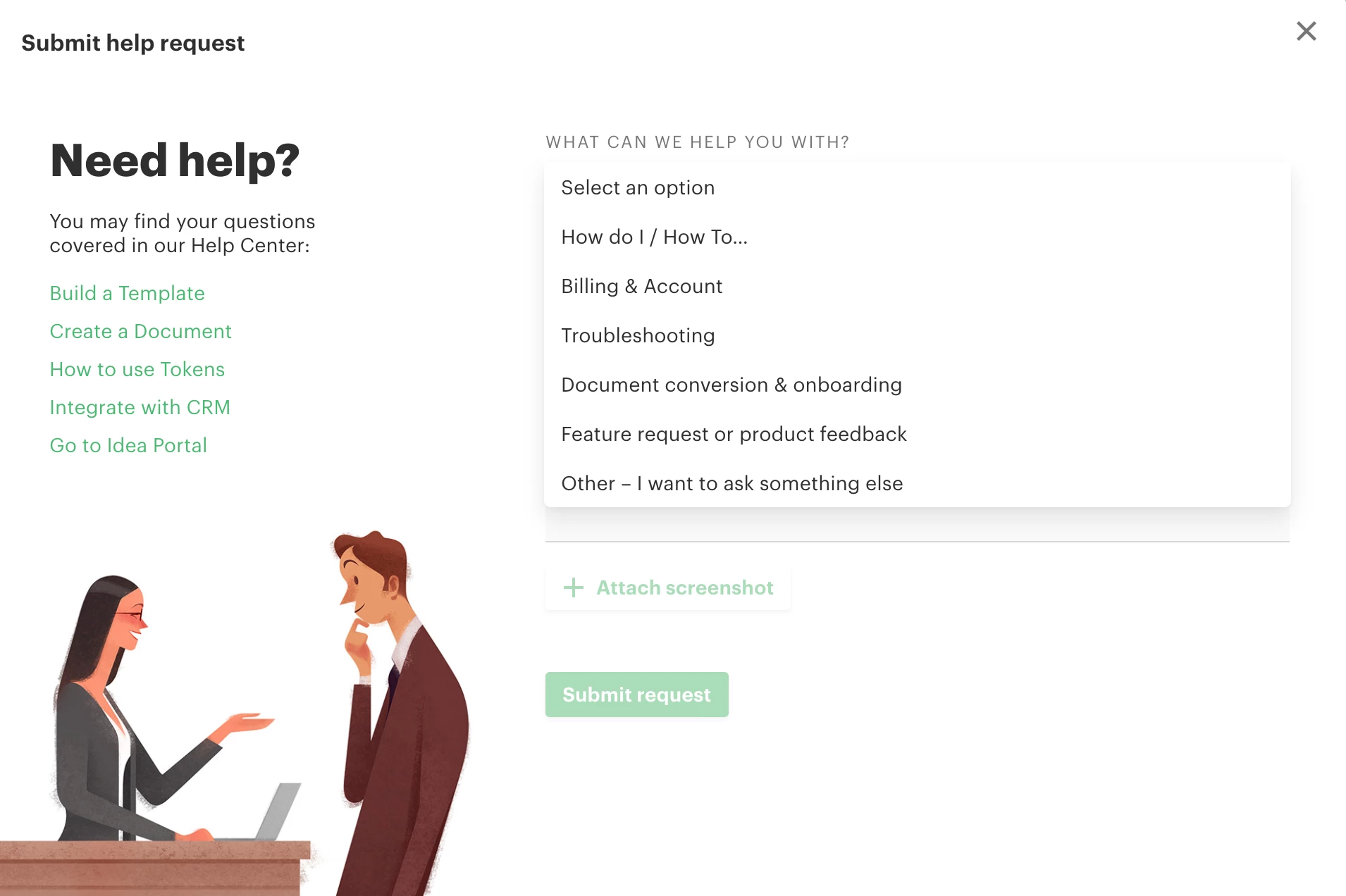 How can I create a pop out 'Submit A Request' form like this that opens once a user clicks 'Submit a request' and doesnt go to another page?