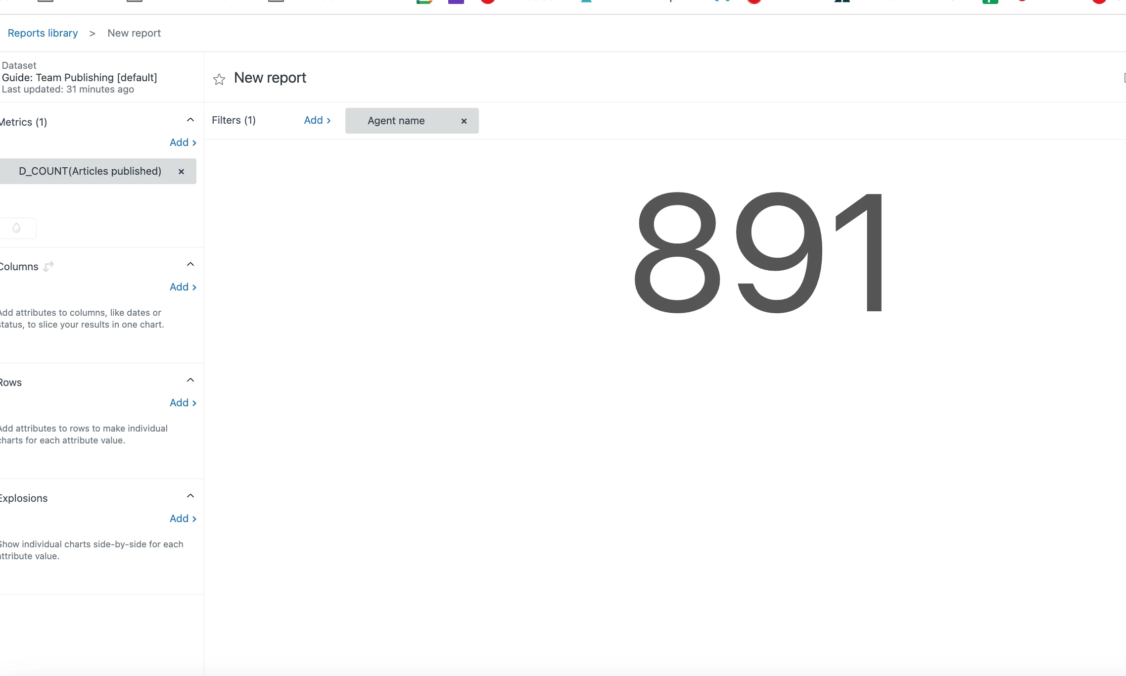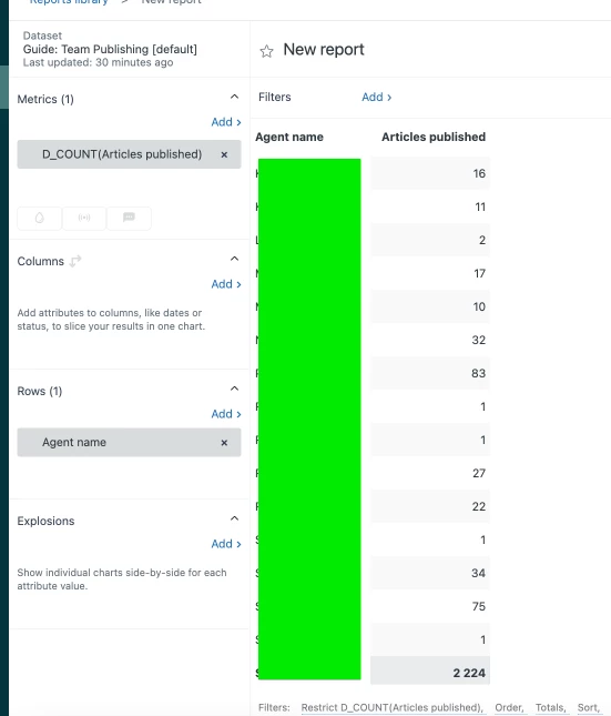I'm trying to understand why the number of articles published changes by over 1k depending on whether or not I show the "agent name" attribute. I have the data filtered to exclude 0.