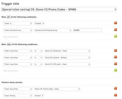 One of my favorite examples: When we have a promo code available, we know that some donors will accidentally complete their donations without entering the code. This is a pretty quick fix for us, but it’s easier to do a big batch all at once. So we have triggers searching for tickets that mention the current promo code, and assigning all those to a single issue area that an agent can work through a couple times a day.