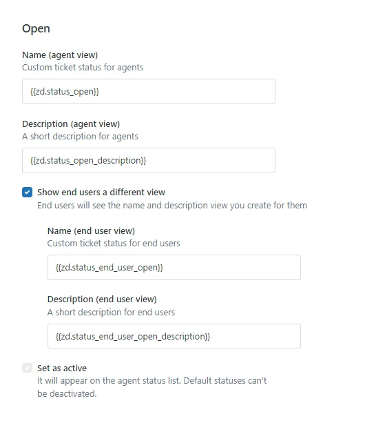 For more information about ticket status agent view and end user view names, see Configuration options for ticket statuses.