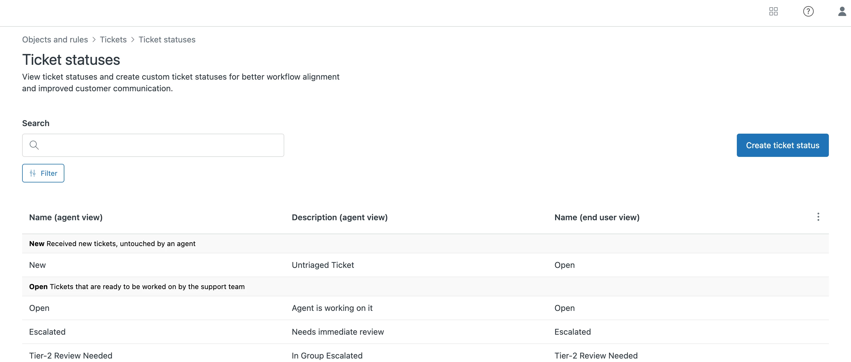 You can search for and filter ticket statuses on the Ticket statuses page.