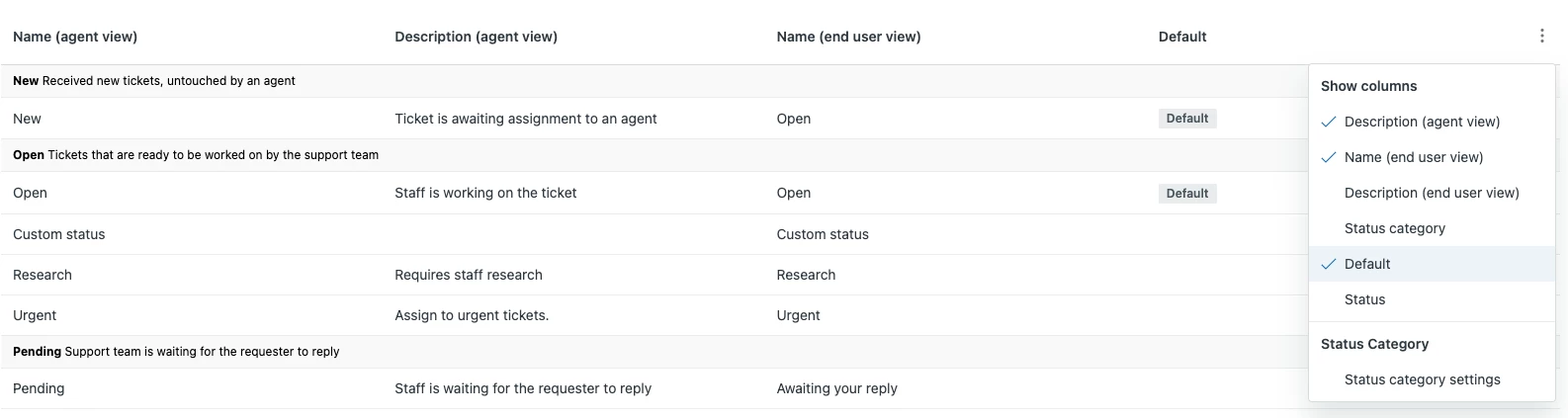 Once you’ve created at least one ticket status in a category, you can change the default ticket status of a status category, if needed. Each status category includes a default ticket status.