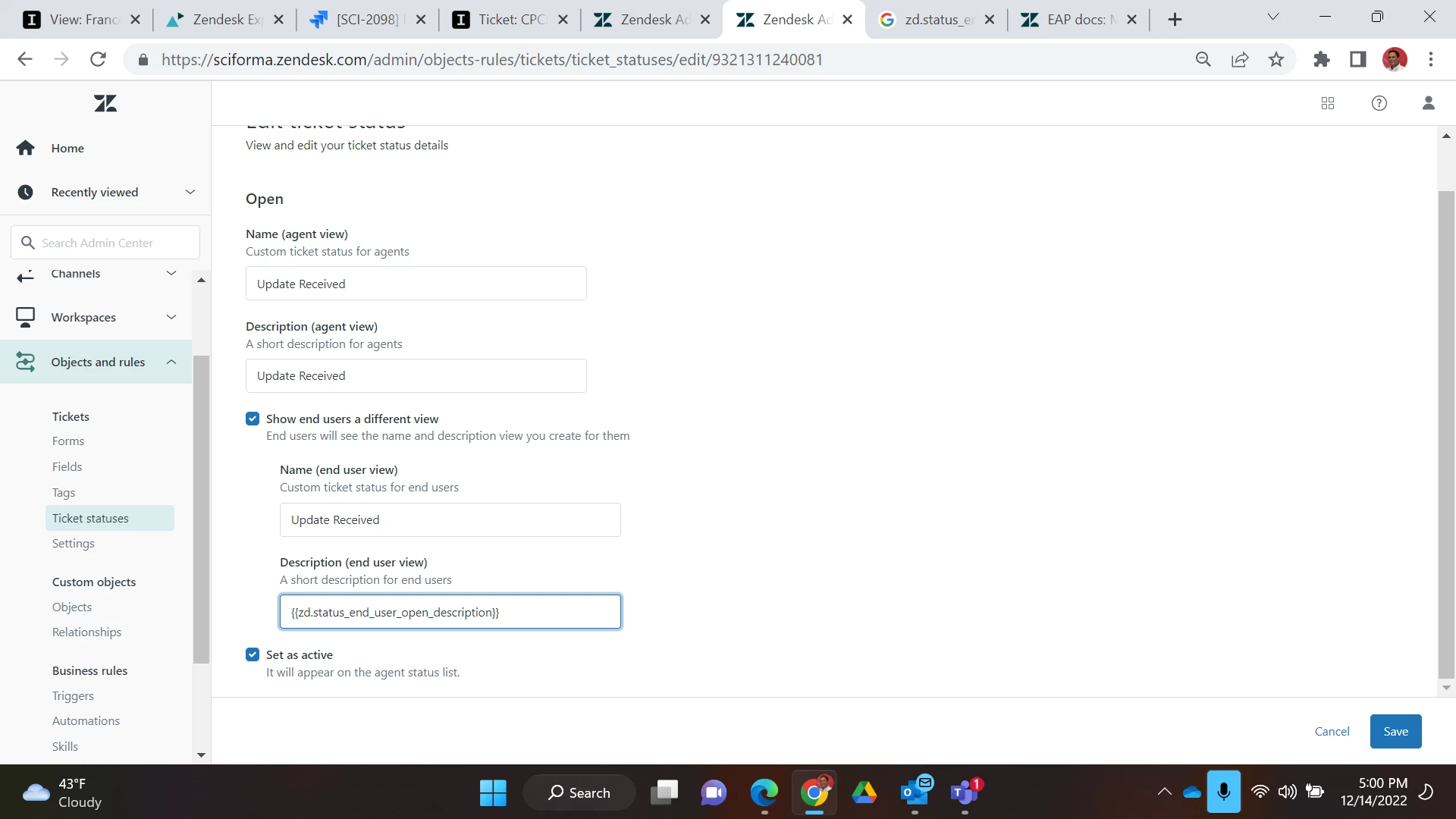 You must be an admin or agent in a custom role with permission to edit ticket statuses.