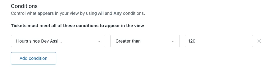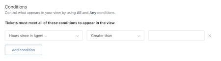 Additionally, you can add time-based views conditions for ticket statuses. For example, you can create a view that uses the new Hours since [ticket status name] condition.