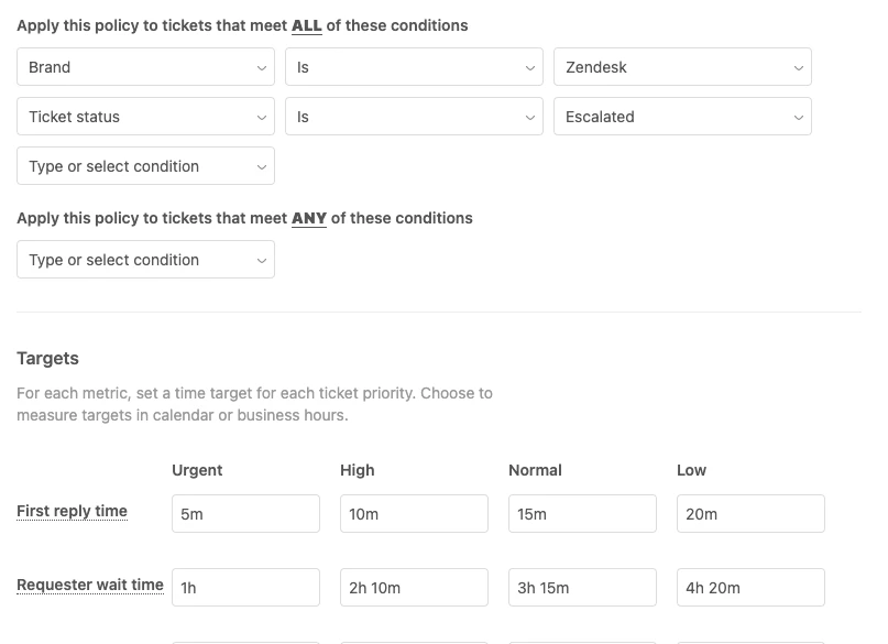 When ticket statuses is disabled, it’s not possible to add a ticket status condition to SLAs (see Defining and using SLA policies). However, after you enable ticket statuses, this changes and you can add Any and All conditions for any ticket status.