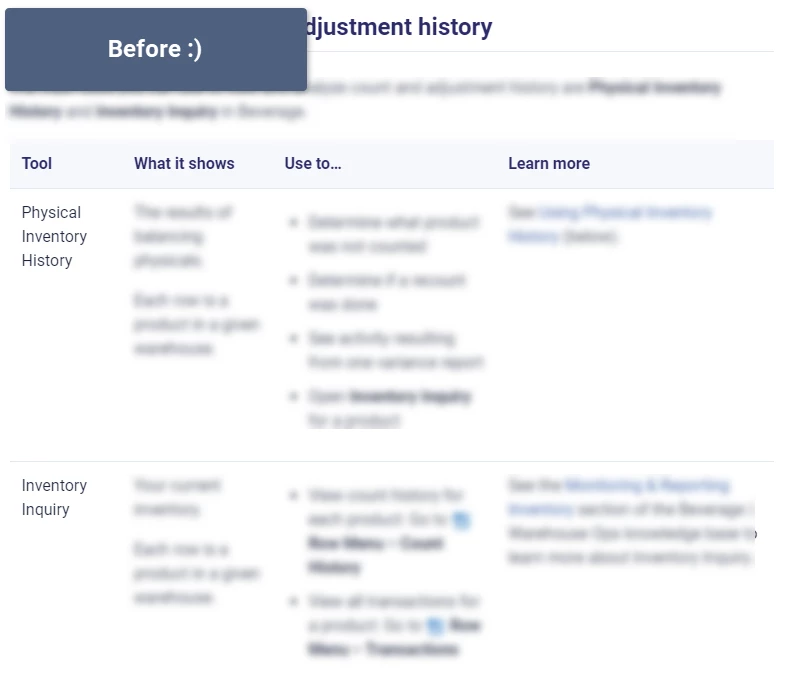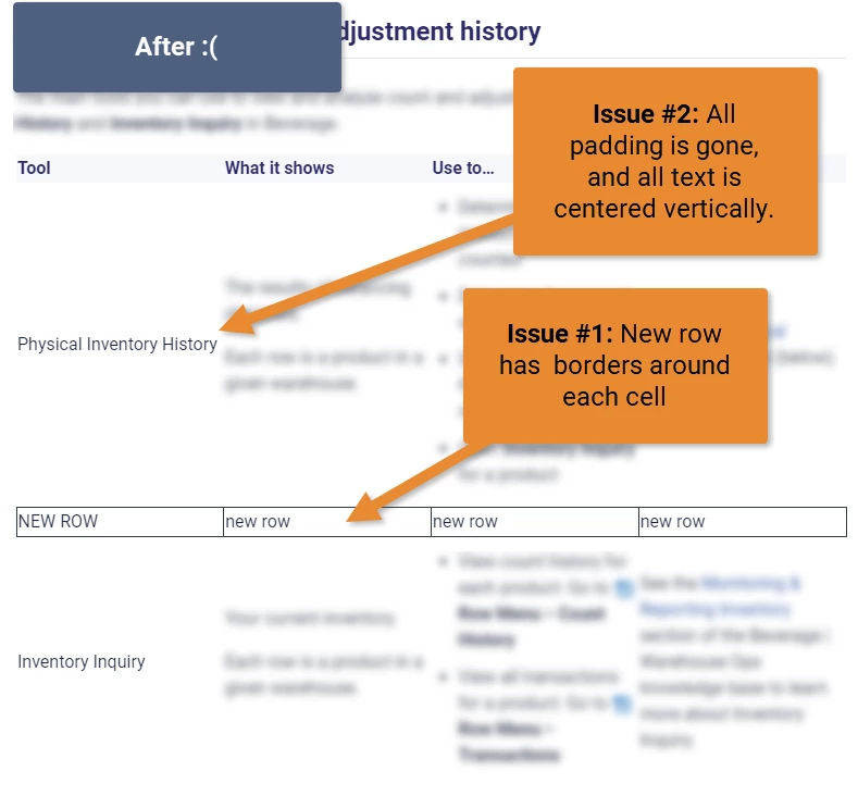 Issue 1: The row I add to Table A now has a border around it, so now I have to either manually remove that styling in the HTML (to keep the table in our original styling) or rebuild the table (to have the table be entirely in the new Zendesk styling). Ideally, we wouldn't get any styling applied over our own settings (as requested in https://support.zendesk.com/hc/en-us/community/posts/8130152734490-Custom-Table-Styles) but at the very least, we need each table to have consistent rows/cells within itself.