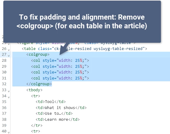 We can fix this by removing the <colgroup> tag, but we have to do this for each table in the article.