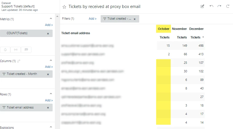 Is that correct, or is there some other reason that 8 of my top 10 support emails don't have tickets received in October (the report below is filtering out tickets where ticket email is NULL and selecting for only created in the last 2 months)? Am I wrong about how to reverse-populate the ticket email data with an automation?