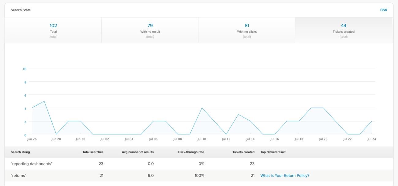 Perhaps your top 3 articles by number of views comprise the majority of activity on our knowledge base. Diving in deeper, we can see that while a page received 1000 views this week, only 45 tickets were created as a result. Taking into account the volume of deflected requests and the cost per contact to your organization, how great are the savings? With more search history, a more meaningful dataset of what users are looking for is the result. This allows you to directly refine your content strategy, the backbone of the self-service experience. Coupled with ease of access via the Web Widget, expect your deflection rates to rise and your CSAT to spike up, both of which are wins.