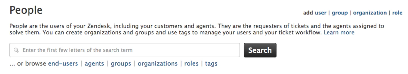 Users can be end-users, but also your administrators, your agents, and light agents. For an overview of user roles, you can check out this article. You can find the list of your users by clicking on the Admin icon on the sidebar, then selecting People. Here you can browse end-users and agents.
