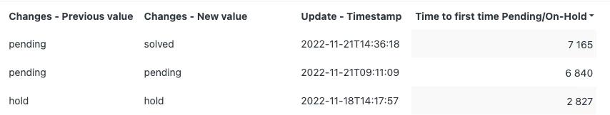 I have been trying to create a report that captures the first time a ticket goes Pending, On-Hold, or if neither of those happens, Solved.