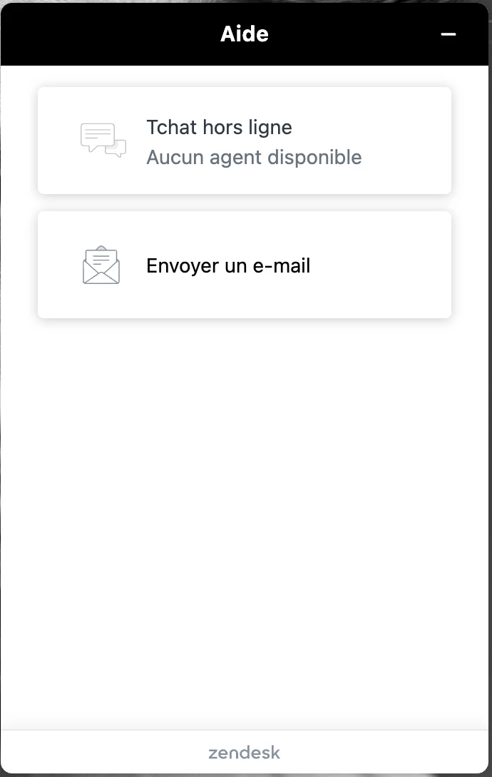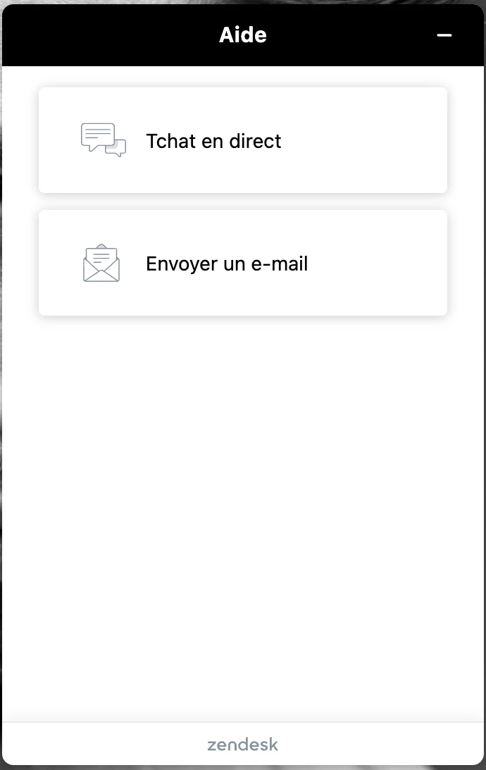 <script type="text/javascript">zE('webWidget', 'setLocale', 'fr');window.zESettings = { "webWidget": { "launcher": { "mobile": { "labelVisible": true }, "label": { "*": "Aide" }, "chatLabel": { "*": "En ligne" } }, "contactOptions": { "enabled": true, "chatLabelOnline": { "*": "Tchat en direct" }, "chatLabelOffline": { "*": "Tchat hors ligne" }, "contactFormLabel": { "*": "Envoyer un e-mail" } }, "contactForm": { "title": { "*": "Formulaire de contact" } }, "chat": { "offlineForm": { "greeting": { "*": "Nous sommes hors ligne actuellement. Laissez nous un message." } }, "title": { "*": "Tchat en direct" } }, "color": { "theme": "#ffffff", "launcher": "#e6e6e6", "launcherText": "#000000", "button": "#000000", "header": "#000000" } }}</script>