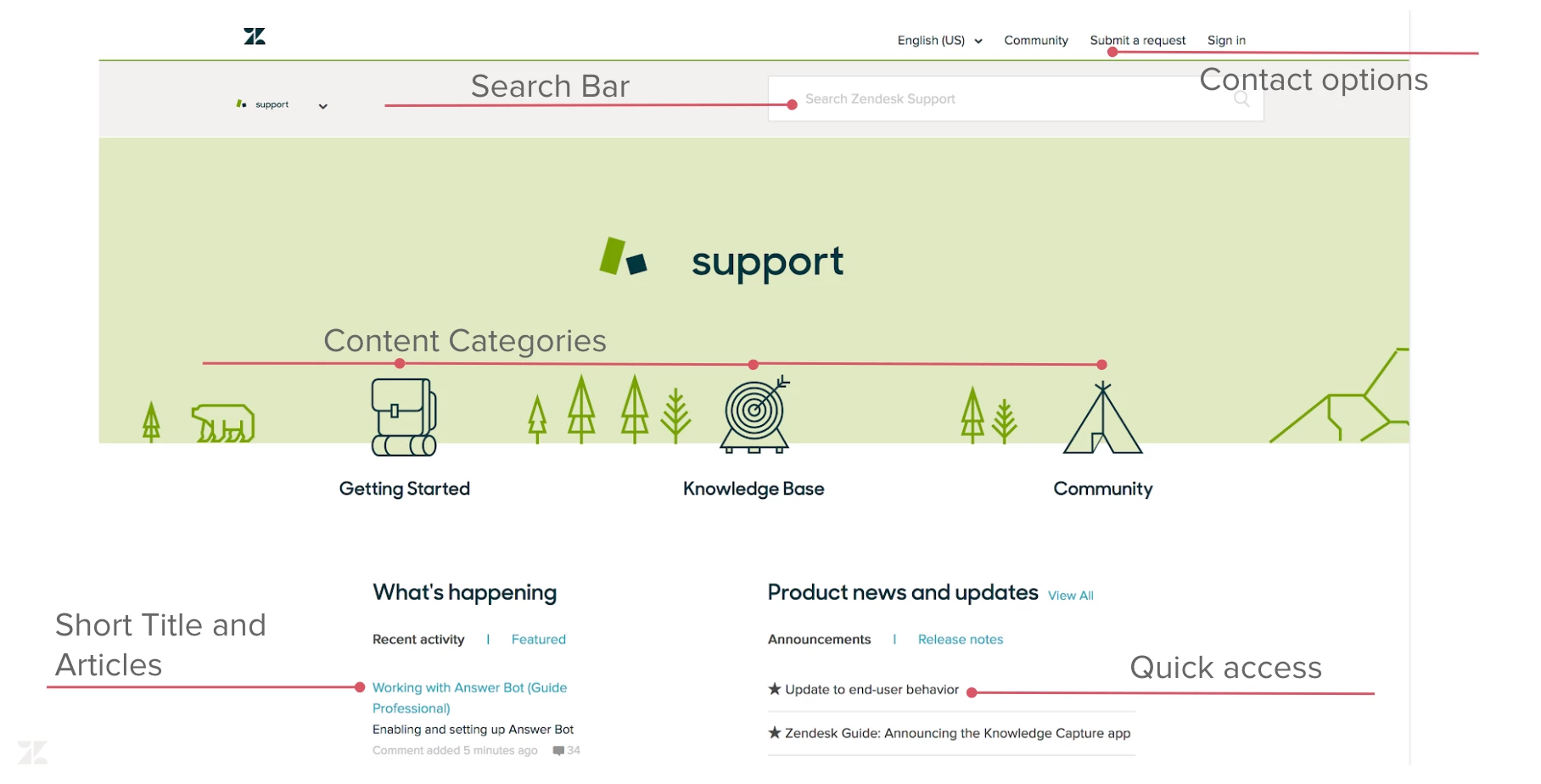 Use the knowledge base for the official content provided by your company or organization. The Help Center consists of three main page types: category landing pages, section landing pages, and articles.