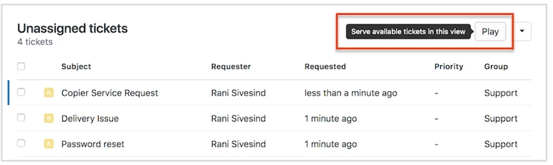 Also, don’t forget to press play. The play button helps minimize agent cherry-picking by serving up the next available ticket that isn’t being addressed by an agent.