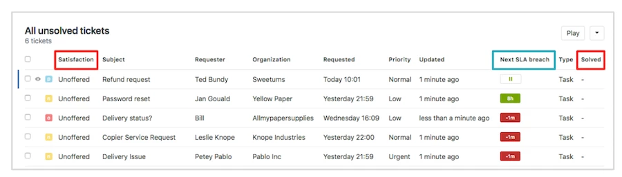 - Another common best practice is to add the “Next SLA Breach” column if you are using the Service Level Agreement feature in Zendesk. You want to have that breach countdown visible to all of your agents so they can prioritize tickets. If you want to learn more about this feature and how it works, our team is hosting a webinar on SLA’s in September.