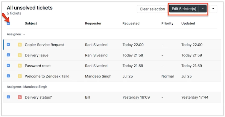 For example, bulk assigning multiple tickets at once is a breeze within views. You can also update ticket fields, delete, merge and mark tickets as spam.