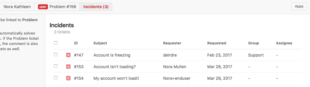 In doing so, you can easily see that this “Avatar Upload Problem” has been reported by X customers. As your team has updates to share and when the problem has been resolved, all they need to do is update the single problem ticket and their comment will cascade down to all of the related incidents and customers (saving loads of time for your agents).