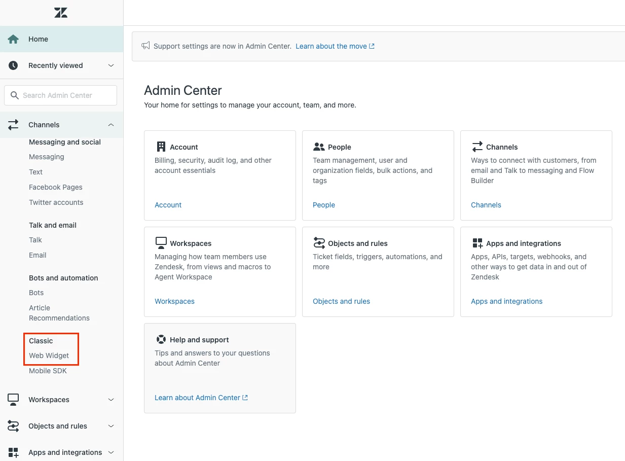 Note: If you have enabled messaging on your account, Web Widget (Classic) is not available. You can work with the messaging Web Widget, or disable messaging to use Web Widget (Classic).
