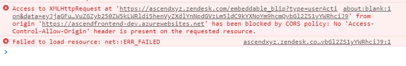 So my issue is that I created a web widget in the Admin Agent panel, used the link provided in the Setup bar, and added it to the application. The widget seems to be opening in Chrome, however, I'm getting a CORS error.