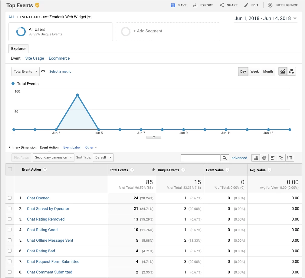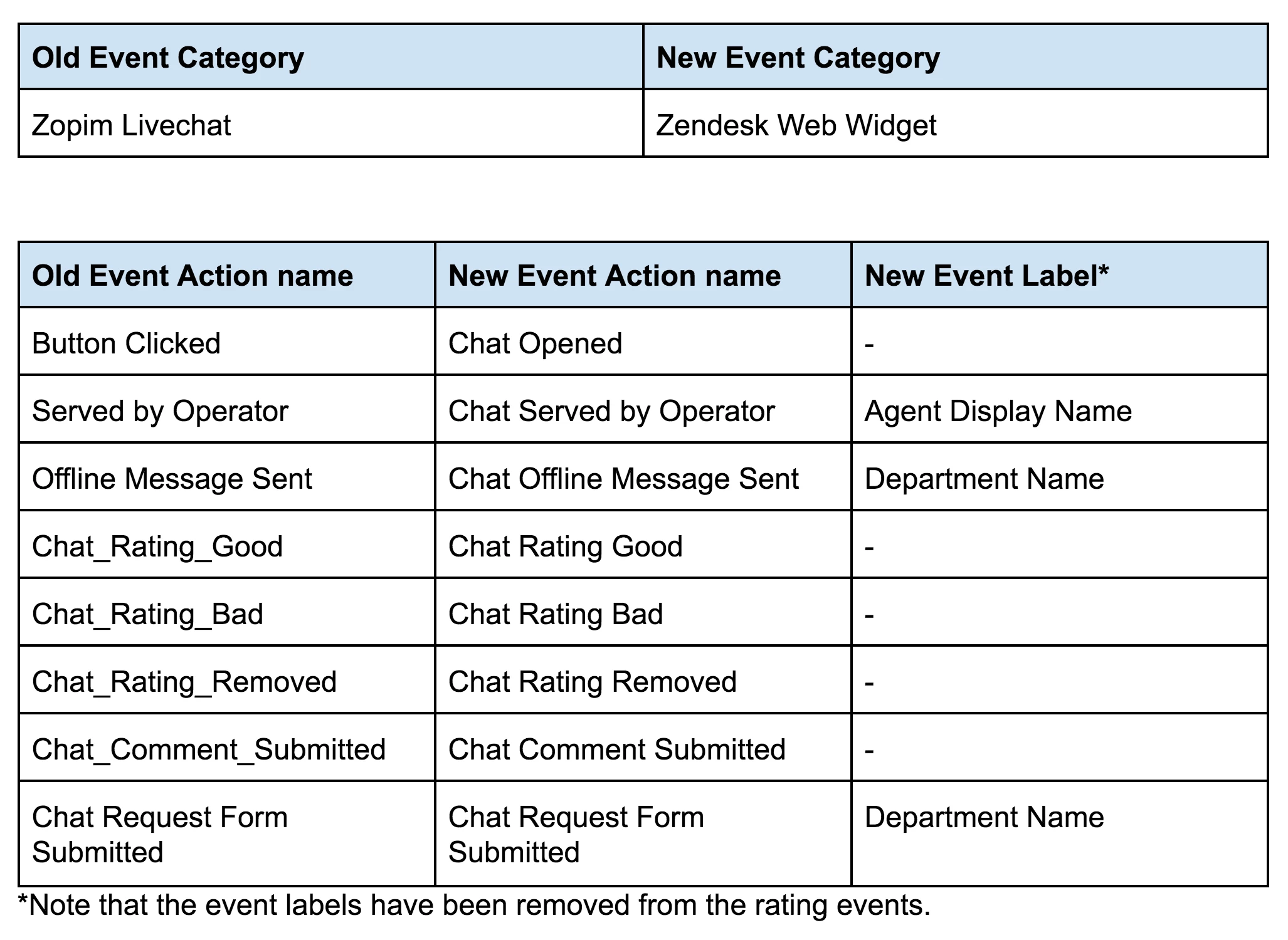 If you are familiar with the previous Chat Widget category and event names, the table and screenshot below outlines the mapping of category and event naming between the old form and new form that you will see in Google Analytics.